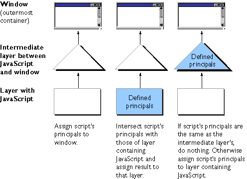 Because the sets of principals differ, they are intersected, yielding a set with one member, the codebase principal. Navigator stores the result on the window object, narrowing its set of principals. Note that all functions that were defined in the signed script are now considered unsigned. Consequently, mixing signed and unsigned scripts on a page without layers results in all scripts being treated as if they were unsigned.