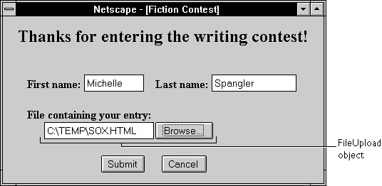 FileUpload object on a form and provides two buttons that let the user display current values of the name and value properties.
