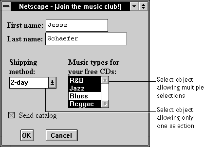 Choose the music type for your free CD:Example 2. The following example displays two selection lists that let the user choose a month and day. These selection lists are initialized to the current date. The user can change the month and day by using the selection lists or by choosing preset dates from radio buttons. Text fields on the form display the values of the