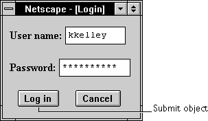 INPUT tag, with "submit" as the value of the TYPE attribute. For a given form, the JavaScript runtime engine creates an appropriate Submit object and puts it in the elements array of the corresponding Form object. You access a Submit object by indexing this array. You can index the array either by number or, if supplied, by using the value of the NAME attribute.
