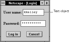 INPUT tag, with "text" as the value of the TYPE attribute. For a given form, the JavaScript runtime engine creates appropriate Text objects and puts these objects in the elements array of the corresponding Form object. You access a Text object by indexing this array. You can index the array either by number or, if supplied, by using the value of the NAME attribute.