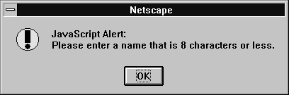 alert("Please enter a name that is 8 characters or less")