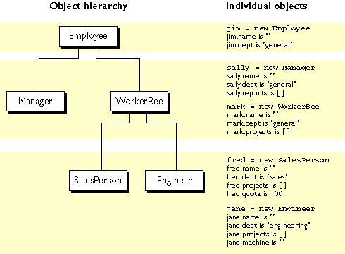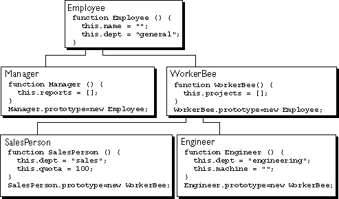 Employee has the properties name (whose value defaults to the empty string) and dept (whose value defaults to "general").Manager is based on Employee. It adds the reports property (whose value defaults to an empty array, intended to have an array of Employee objects as its value).WorkerBee is also based on Employee. It adds the projects property (whose value defaults to an empty array, intended to have an array of strings as its value).SalesPerson is based on WorkerBee. It adds the quota property (whose value defaults to 100). It also overrides the dept property with the value "sales", indicating that all salespersons are in the same department.Engineer is based on WorkerBee. It adds the machine property (whose value defaults to the empty string) and also overrides the dept property with the value "engineering".