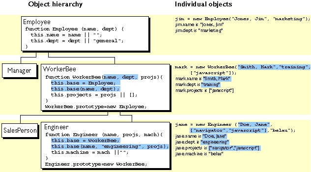 Engineer and SalesPerson definitions create objects that descend from WorkerBee and hence from Employee. An object of these types has properties of all the objects above it in the chain. In addition, these definitions override the inherited value of the dept property with new values specific to these objects.
