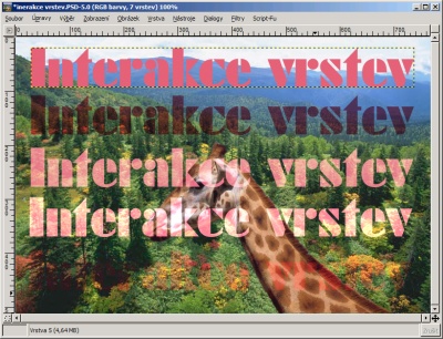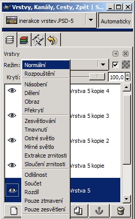 Již víme, že vrstvy si můžeme představit jako průhledné fólie, které jsou položeny na sobě Princip vrstevVrstvám můžeme nastavovat různé krytí a navíc můžeme volit režim jejich vzájemného působení. (Viz obrázky na této stránce.)Tip: Vrstvy se často používají i na „obyčejné“ operace, např. doostření. Vrstvu s obrázkem zduplikujeme, v horní vrstvě provedeme doostření a pak snížíme její krytí, aby operace nebyla tak výrazná. |