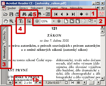 Soubor v PDF formátu můžeme přečíst ve zdarma šířeném prohlížečiOtevřít autorský zákon v Adobe Acrobat Readeru(Pokud se objeví dotaz na otevření souboru, zvolte Otevřít.) Nemůžeme ho však lehce upravit (jen z něj zkopírovat text) a odeslat zpět. Hodí se na manuály, návody apod., kde se nepředpokládají jiné operace než čtení dokumentu a jeho tisk.Lehce můžeme:1. Přecházet mezi stránkami. (Také 1b vlevo dole.)2. Měnit zobrazení stránky.3. Nechat si zobrazit miniatury stránek a případné tvůrcem definované záložky.4. Označit text.5. Prohledávat dokument.Samozřejmě můžeme dokument vytisknout na tiskárně. |